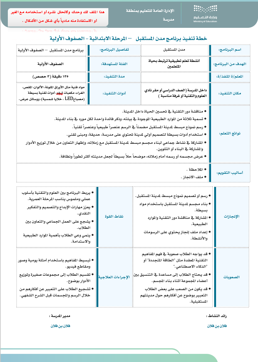هذا الملف رقمي ( WORD ) صُمم خصيصًا للمعلم/ـة المسند له برامج النشاط الطلابي في مدارس التعليم، مطابق للأدلة المعتمدة من المركز الوطني للمناهج ، وبتصميم احترافي متوافق مع الهوية البصرية للوزارة.