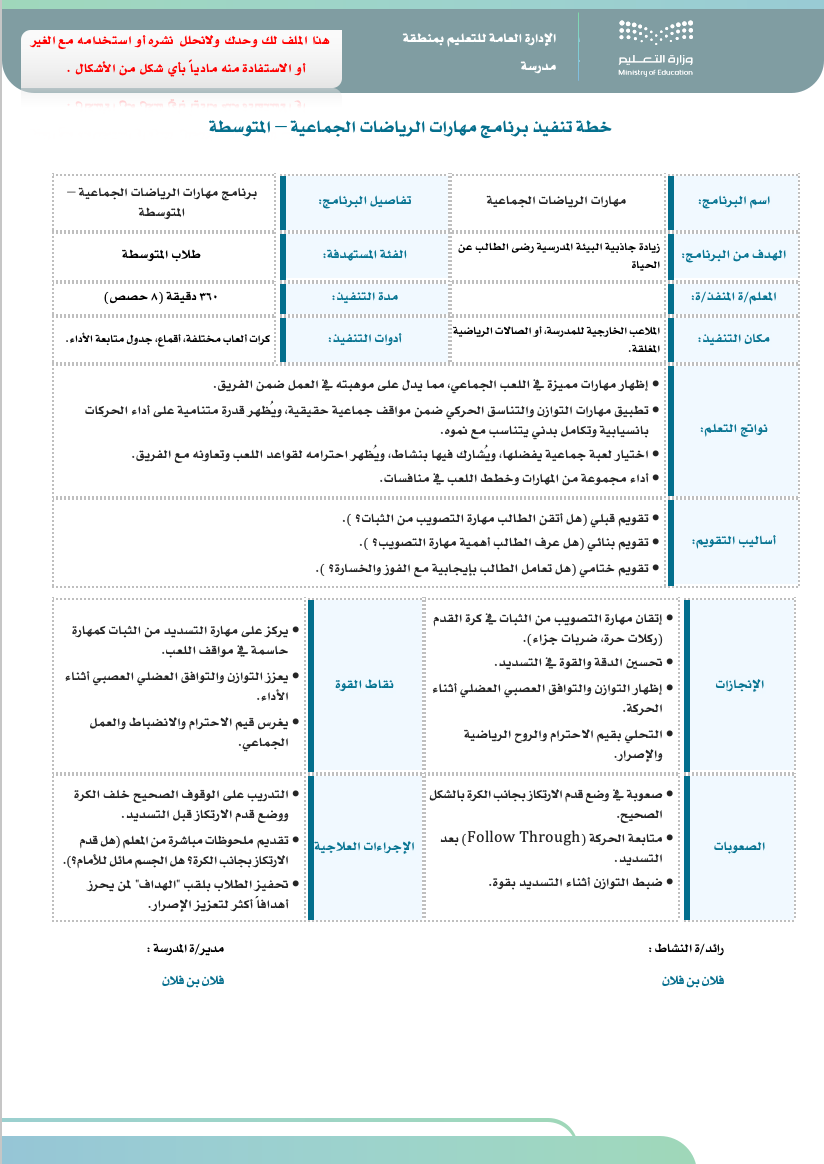 هذا الملف رقمي ( WORD ) صُمم خصيصًا للمعلم/ـة المسند له برامج النشاط الطلابي في مدارس التعليم، مطابق للأدلة المعتمدة من المركز الوطني للمناهج ، وبتصميم احترافي متوافق مع الهوية البصرية للوزارة.