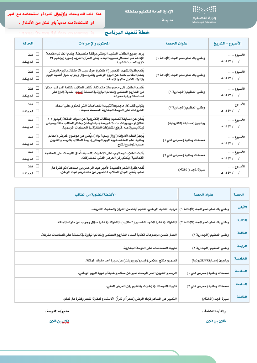 هذا الملف رقمي ( WORD ) صُمم خصيصًا للمعلم/ـة المسند له برامج النشاط الطلابي في مدارس التعليم، مطابق للأدلة المعتمدة من المركز الوطني للمناهج ، وبتصميم احترافي متوافق مع الهوية البصرية للوزارة.