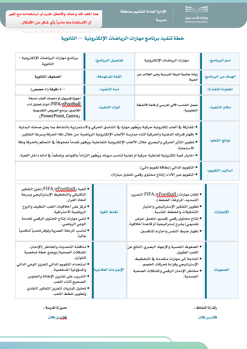 هذا الملف رقمي ( WORD ) صُمم خصيصًا للمعلم/ـة المسند له برامج النشاط الطلابي في مدارس التعليم، مطابق للأدلة المعتمدة من المركز الوطني للمناهج ، وبتصميم احترافي متوافق مع الهوية البصرية للوزارة.